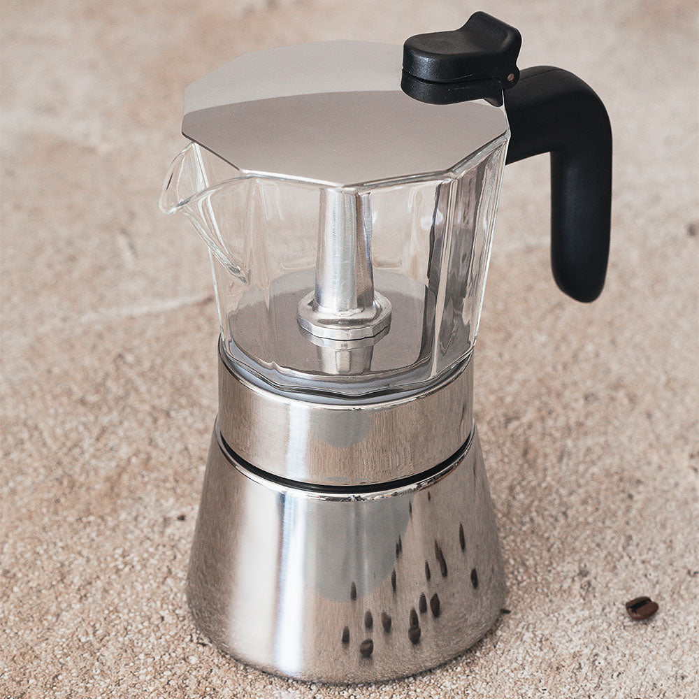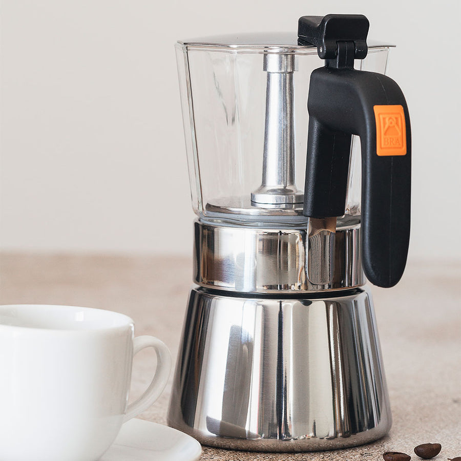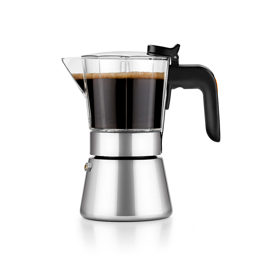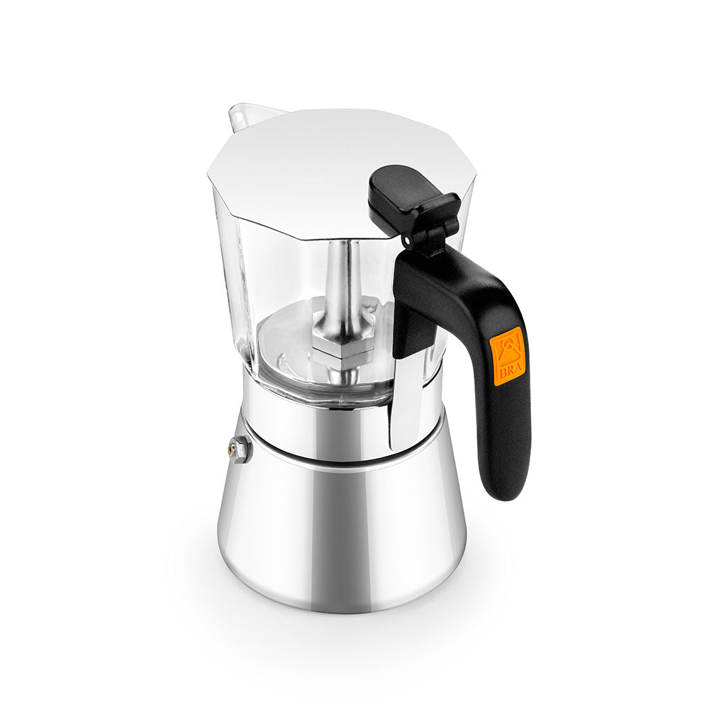 La cafetera está fabricada en acero inoxidable y vidrio de borosilicato. El espesor del cuerpo inferior de acero inoxidable ferrítico le confiere una gran resistencia a las deformaciones y permite conseguir la máxima eficiencia en la conductividad de las placas de inducción. El fondo difusor full induction la hace apta para todo tipo de cocinas, incluida la inducción.