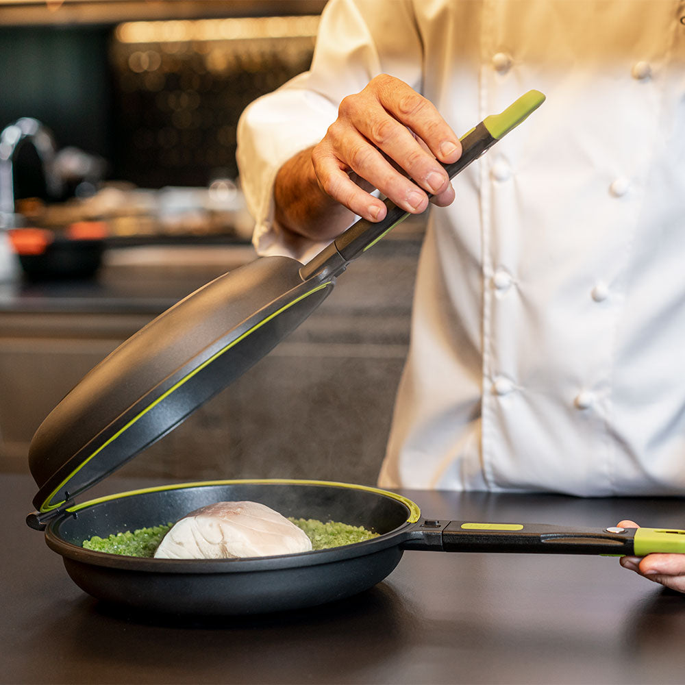 - Braten mit Ofeneffekt: Dank seiner isolierenden Dichtung und des Magneten im Griff erzeugt er einen völlig gleichmäßigen Ofeneffekt im Inneren der Pfanne.