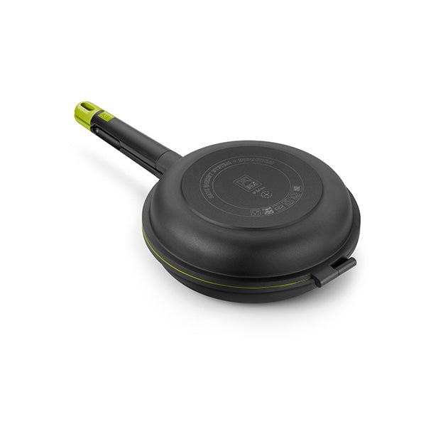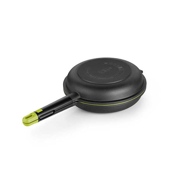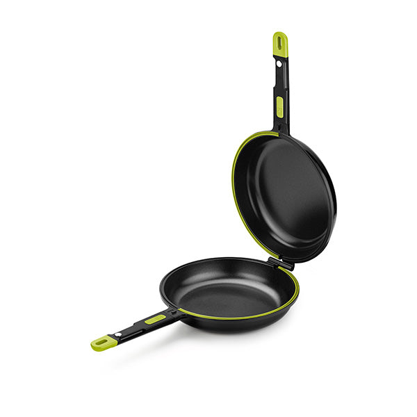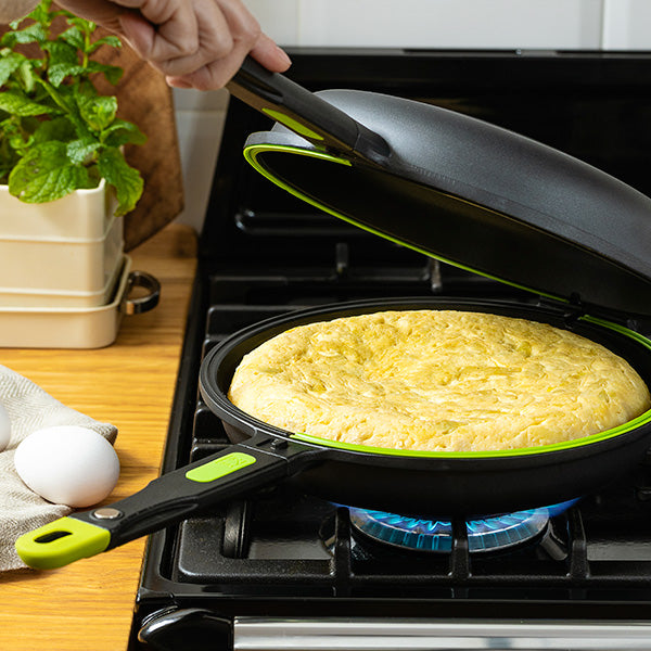 Es ist ideal zum Garen von Tortillas ohne Verbrennungsgefahr beim Wenden. Diese Bratpfanne von Dupla besteht aus zwei Pfannen, die dank ihres luftdichten Verschlusses ineinander passen. grüne Farbe, um ein Verschütten der Wende zu vermeiden.