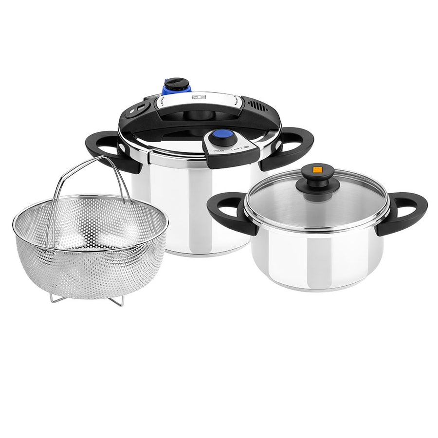 Mit dem Schnellkochtopf können Sie problemlos unzählige Rezepte zubereiten, wobei die Vitamine und Nährstoffe der Lebensmittel maximal erhalten bleiben und die Zubereitungszeit minimiert wird. Durch das Kochen in einem Schnellkochtopf sparen Sie mehr als die Hälfte der Zeit, sodass die Zubereitung von Eintöpfen sehr schnell und effizient ist und außerdem erhebliche Energieeinsparungen bedeutet. Mit seinem Deckel können Sie schnell kochen, aber auch als herkömmlicher Topf eignet er sich perfekt, um auf Wunsch viele traditionelle Rezepte zuzubereiten. Sie können in kürzester Zeit köstliche Eintöpfe zubereiten. Sowohl Gemüse als auch Hülsenfrüchte, Reis oder Nudeln sind sehr schnell und mit perfektem Ergebnis fertig. Ein Rindereintopf mit Gemüse, ein mit Datteln und Schinken gefülltes Hähnchen, ein paar Schweinebacken in Rotwein oder eine asturische Fabada werden im Schnellkochtopf sehr lecker zubereitet. Neben Brühen, Gemüsecremes oder Gemüsepürees können Sie auch köstliche Desserts und Süßigkeiten wie Flans, Kekse, Käsekuchen, Apfelkompott oder Marmelade mit Früchten der Saison zubereiten. Ein sehr vielseitiges und unverzichtbares Gerät, mit dem Sie einfach und sicher kochen können, mit allen Vorteilen und ohne auf die gewohnten Aromen verzichten zu müssen, und das auch eine erhebliche Zeit- und Energieersparnis bedeutet.