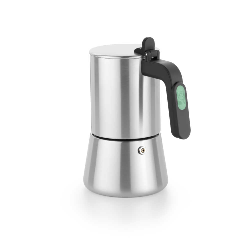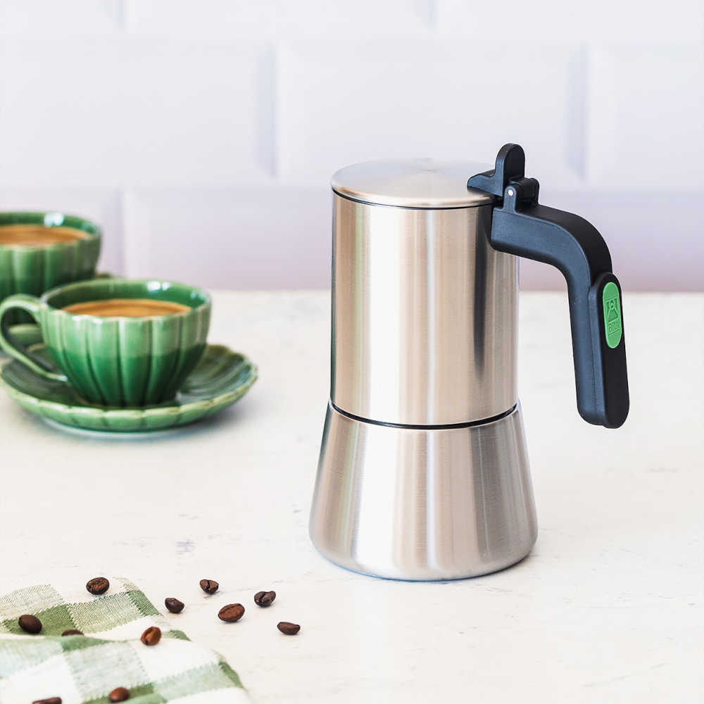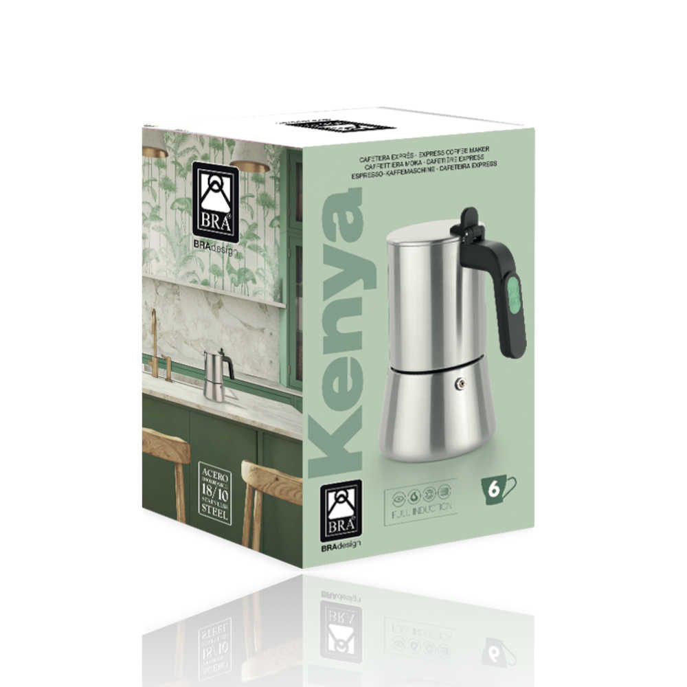 La cafetera Kenya es ideal para preparar el tradicional café de siempre con excelentes resultados. Su elegante diseño destaca por su tapa articulada de uso con una sola mano y por su pomo y asa de baquelita, con acabado de toque suave para un manejo cómodo y seguro.