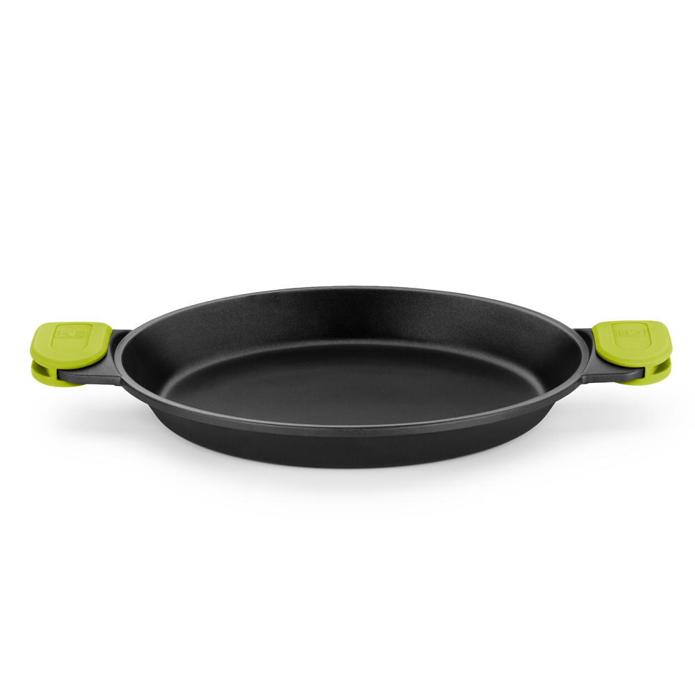 Incluye dos asas de silicona en color verde para coger la paellera con comodidad.