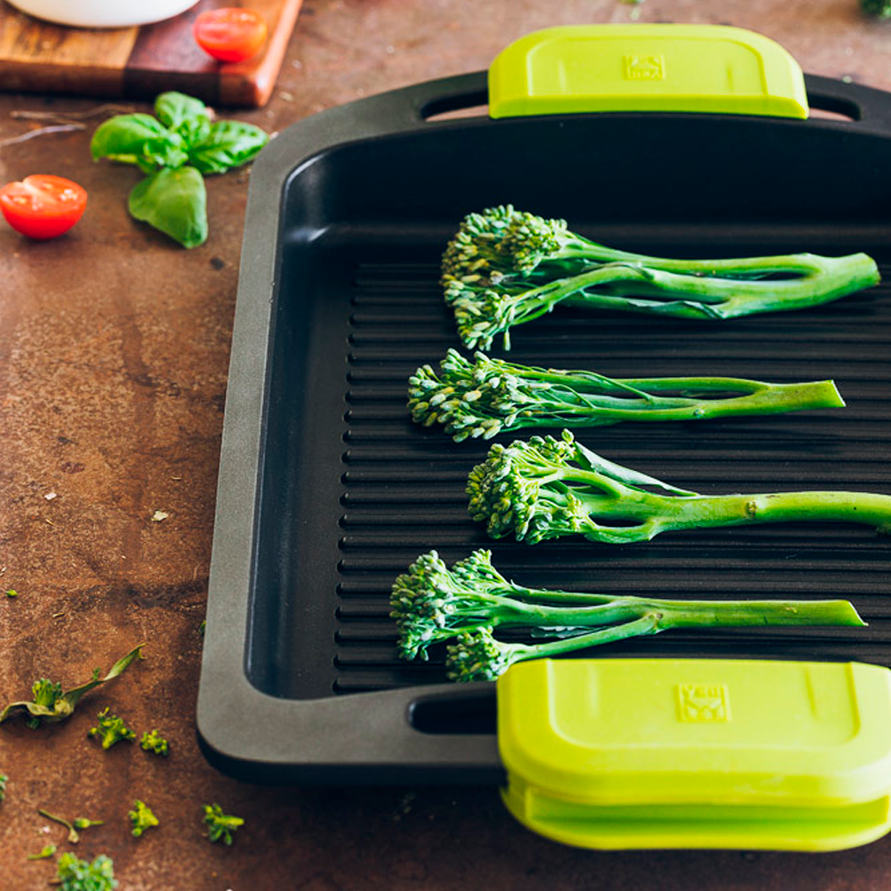 Incluye dos asas de silicona en color verde para coger la parrilla con comodidad.