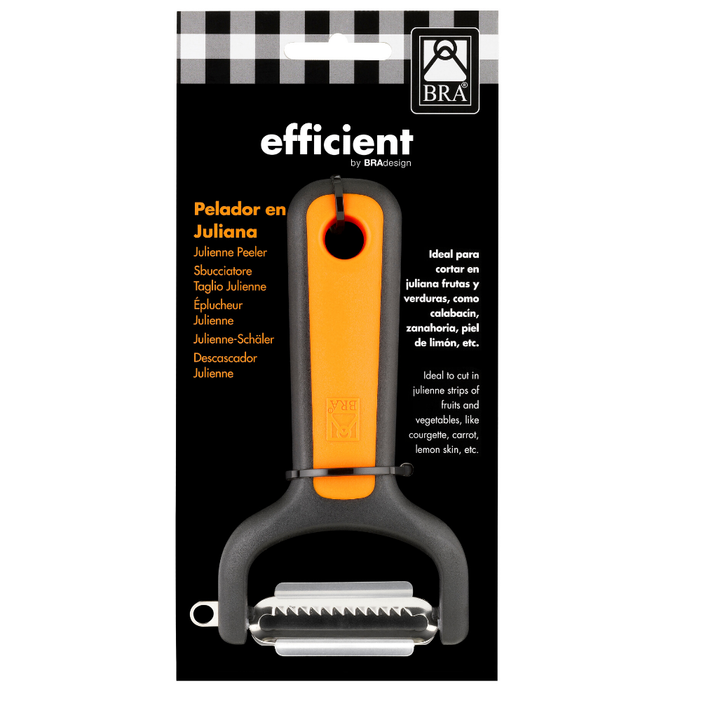 El pelador juliana Y Efficient está fabricado en acero inoxidable y materiales de alta calidad para ofrecer un corte perfecto y facilitar al máximo el día a día en la cocina.