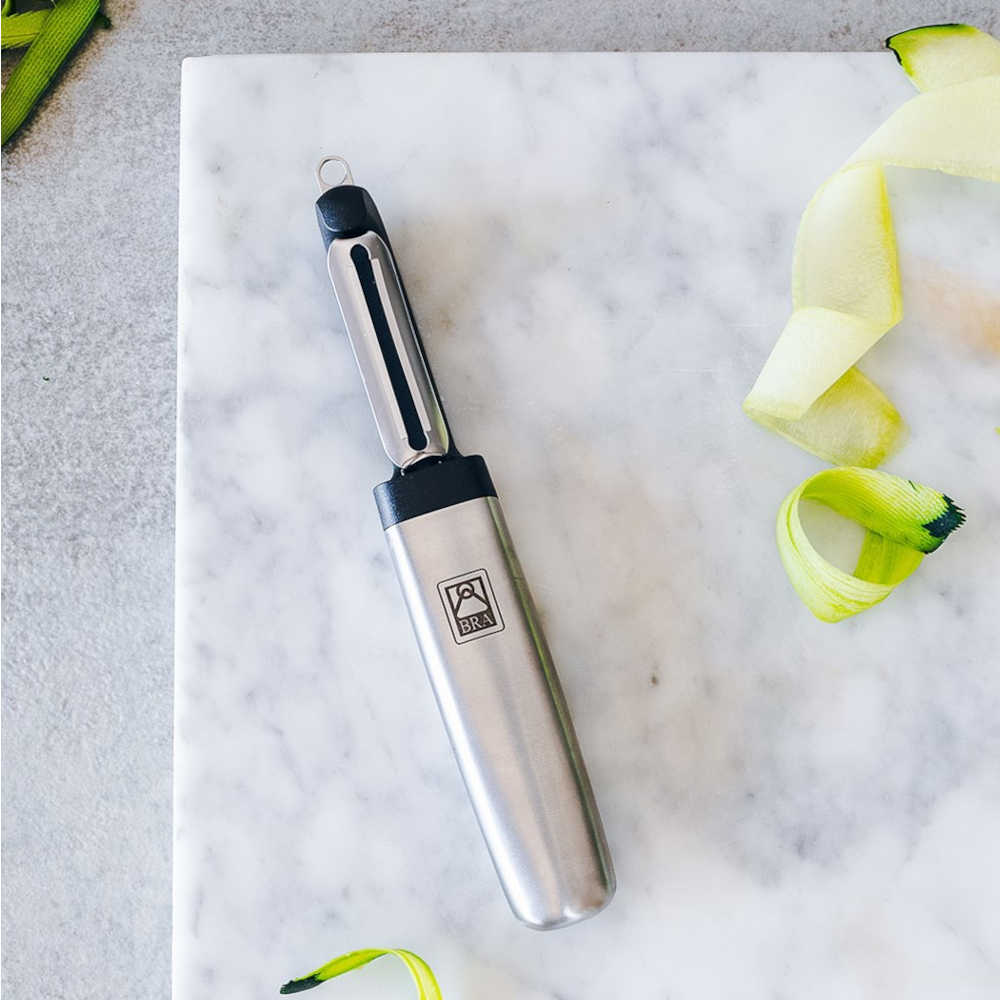 El pelador liso está diseñado en forma de I y dispone de cuchilla lisa de acero inoxidable muy afilada para un corte preciso y eficiente. El pelador tiene un punzón para retirar los brotes y marcas de las patatas y demás vegetales. Es una herramienta perfecta para pelar frutas y verduras redondas de manera extrafina.